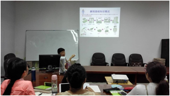 唐教授从解剖基础知识入手,讲解人体的组成,把人体组成比喻成建房子,深入浅出地剖析各个组成部件,把复杂的人体构造简单化、通俗化,使大家在轻松、活跃的课堂中轻而易举的把知识装进了脑袋。